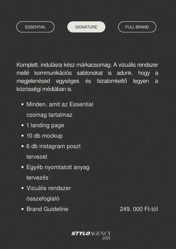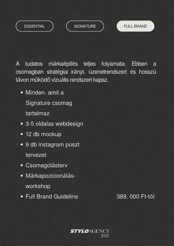 A tudatos márkaépítés teljes folyamata. Ebben a csomagban stratégiai irányt, üzenetrendszert és hosszú távon működő vizuális rendszert kapsz.