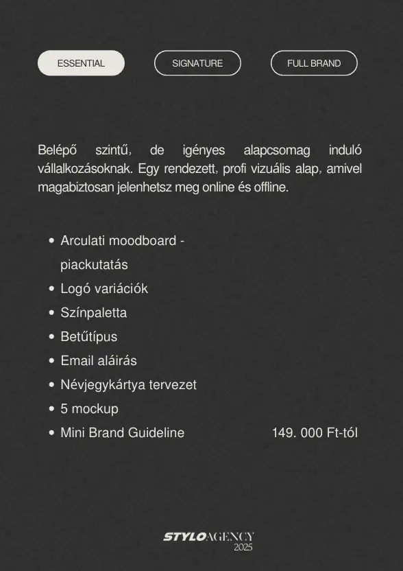 Belépő szintű, de igényes alapcsomag induló vállalkozásoknak. Egy rendezett, profi vizuális alap, amivel magabiztosan jelenhetsz meg online és offline.
